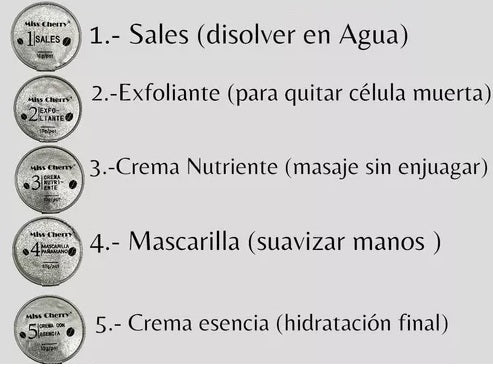 KIT PARA CUIDADO DE MANOS Instrucciones 1. Sales: Disolver en poca agua tibia y remojar las manos de 5 a 10 minutos. 2. Exfoliante: Con las manos húmedas aplicar una cantidad adecuada en las manos y masajear de 2 a 3 minutos. Enjuagar y secar manos. 3. Crema nutriente: Aplicar una cantidad adecuada y masajear hasta su absorción. 4. Mascarilla: Aplicar uniformemente en las manos y esperar 10 minutos a que absorba por completo. 5. Crema con esencia: Tomar la crema necesaria y aplicar dando un ligero masaje en todas las manos hasta que el producto se absorba. Una vez que se haya terminado todo el proceso notarás que tus manos quedan suaves y limpias con un rico aroma a café. CONTENIDO: - 1 recipiente sales 10 gr - 1 recipiente exfoliante exfoliante 10 gr - 1 recipiente crema nutriente 10 gr - 1 recipiente mascarilla 10 gr - 1 recipiente crema con esencia 10 gr - 1 aplicador para mascarillas de plástico cristalino Este contenido sirve de una a tres aplicaciones.